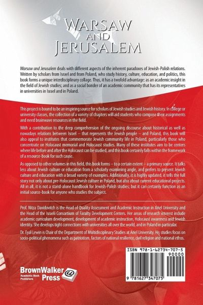 Warsaw and Jerusalem deals with different aspects of the inherent paradoxes of Jewish-Polish relations. Written by scholars from Israel and from Poland, who study history, culture, education, and politics, this book forms a unique interdisciplinary collage. Thus, it has a twofold advantage: as an academic insight in the field of Jewish studies; and as a social bonder of an academic community that has its representatives in universities in Israel and in Poland. This project is bound to be an inspiring source for scholars of Jewish studies and Jewish history. In college or university classes, the collection of a variety of chapters will aid students who compose their assignments and need brainwave resources in the field. With a contribution to the deep comprehension of the ongoing discourse about historical as well as nowadays relations between Israel – that represents the Jewish people – and Poland, this book will also appeal to institutes that commemorate Jewish community life in Poland, particularly those who concentrate on Holocaust memorial and Holocaust studies. Many of these institutes aim to be centers where life before and after the Holocaust can be studied, and this book certainly falls within the framework of a resource-book for such cause. As opposed to other volumes in this field, this book forms – to a certain extent – a primary source. It talks less about Jewish culture or education from a scholarly examining angle, and prefers to present Jewish culture and education with a broad variety of examples. Additionally, it is highly updated, it tells the full story not only about pre-Holocaust Jewish culture in Poland, but also about current educational projects. All in all, it is not a stand-alone handbook for Jewish-Polish studies; but it can certainly function as an initial source-book for anyone who studies the subject.