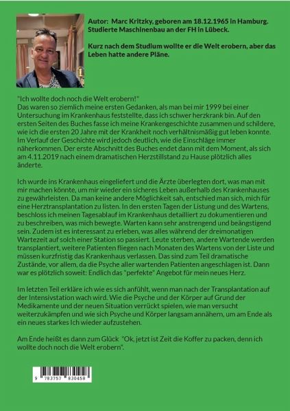 "Ich wollte doch noch die Welt erobern!" Das waren so ziemlich meine ersten Gedanken, als man bei mir 1999 bei einer Untersuchung im Krankenhaus feststellte, dass ich schwer herzkrank bin. Auf den ersten Seiten des Buches fasse ich meine Krankengeschichte zusammen und schildere, wie ich die ersten 20 Jahre mit der Krankheit noch verhältnismäßig gut leben konnte. Im Verlauf der Geschichte wird jedoch deutlich, wie die Einschläge immer näherkommen. Der erste Abschnitt des Buches endet dann mit dem Moment, als sich am 4.11.2019 nach einem dramatischen Herzstillstand zu Hause plötzlich alles änderte. Ich wurde ins Krankenhaus eingeliefert und die Ärzte überlegten dort, was man mit mir machen könnte, um mir wieder ein sicheres Leben außerhalb des Krankenhauses zu gewährleisten. Da man keine andere Möglichkeit sah, entschied man sich, mich für eine Herztransplantation zu listen. In den ersten Tagen der Listung und des Wartens, beschloss ich meinen Tagesablauf im Krankenhaus detailliertzu dokumentieren und zu beschreiben, was mich bewegte. Warten kann sehr anstrengend und beängstigend sein. Zudem ist es interessant zu erleben, was alles während der dreimonatigen Wartezeit auf solch einer Station so passiert. Leute sterben, andere Wartende werden transplantiert, weitere Patienten fliegen nach Monaten des Wartens von der Liste und müssen kurzfristig das Krankenhaus verlassen. Das sind zum Teil dramatische Zustände, vor allem, da die Psyche aller wartenden Patienten angeschlagen ist. Dann war es plötzlich soweit: Endlich das "perfekte" Angebot für mein neues Herz. Im letzten Teil erkläre ich wie es sich anfühlt, wenn man nach der Transplantation auf der Intensivstation wach wird. Wie die Psyche und der Körper auf Grund der Medikamente und der neuen Situation verrückt spielen, wie man versucht weiterzukämpfen und wie sich Psyche und Körper langsam annähern, um am Ende als ein neues starkes Ich wieder aufzustehen. Am Ende heißt es dann zum Glück "Ok, jetzt ist Zeitdie Koffer zu packen, denn ich wollte doch noch die Welt erobern"