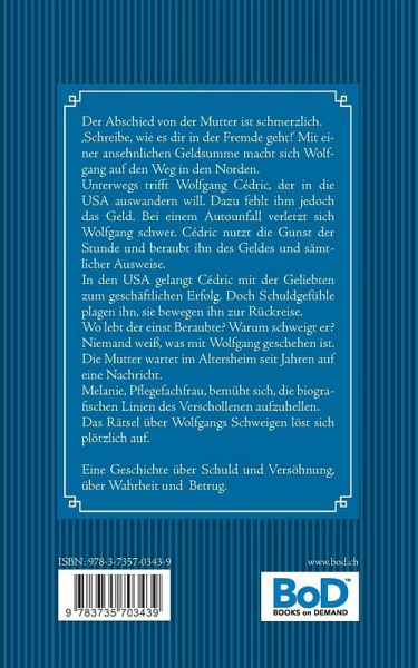 Der Abschied von der Mutter ist schmerzlich.'Schreibe, wie es dir in der Fremde geht!' Mit einer ansehnlichen Geldsumme macht sich Wolfgang auf den Weg in den Norden.Unterwegs trifft Wolfgang Cédric, der in die USA auswandern will. Dazu fehlt ihm jedoch das Geld. Bei einem Autounfall verletzt sich Wolfgang schwer. Cédric nutzt die Gunst der Stunde und beraubt ihn des Geldes und sämtlicher Ausweise.In den USA gelangt Cédric mit der Geliebten zum geschäftlichen Erfolg. Doch Schuldgefühle plagen ihn, sie bewegen ihn zur Rückreise.Wo lebt der einst Beraubte? Warum schweigt er?Niemand weiß, was mit Wolfgang geschehen ist. Die Mutter wartet im Altersheim seit Jahren auf eine Nachricht.Melanie, Pflegefachfrau, bemüht sich, die biografischen Linien des Verschollenen aufzuhellen.Das Rätsel über Wolfgangs Schweigen löst sich plötzlich auf.Eine Geschichte über Schuld und Versöhnung, über Wahrheit und Betrug.