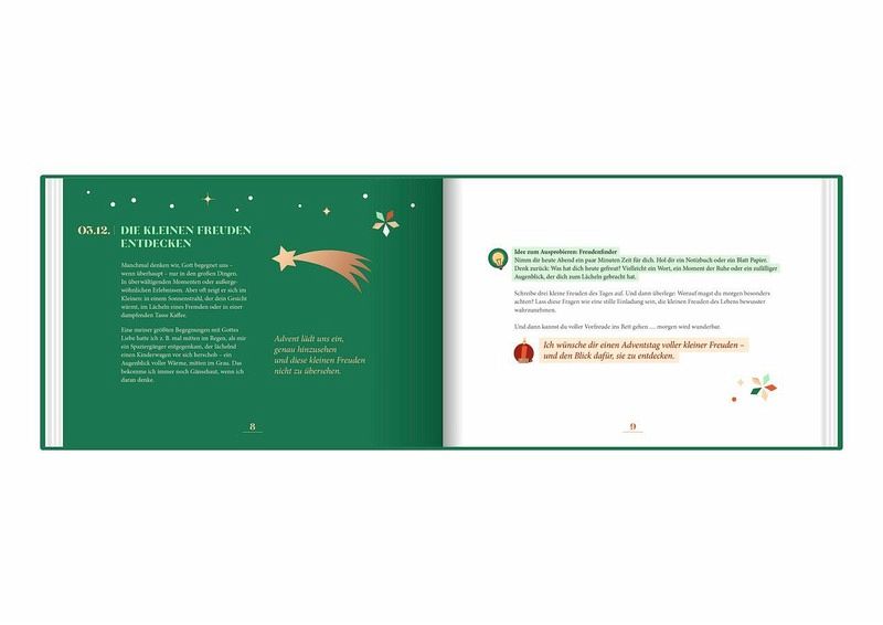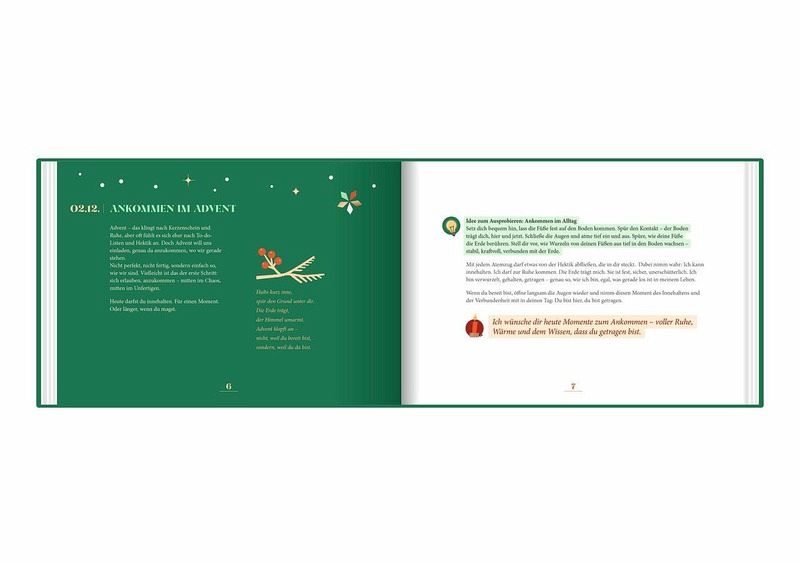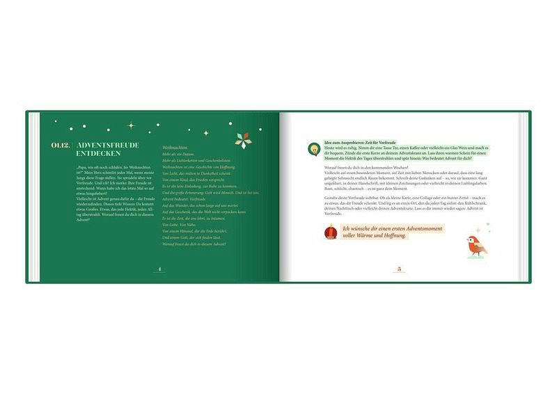 Advent ist mehr als Kerzenlicht und Weihnachtsmarkt. Es ist eine Einladung zum Warten, zum Innehalten, zum Staunen. Doch in der Hektik des Dezembers geht das oft unter. Dieses Buch begleitet daher mit stimmungsvollen Texten und Gedichten durch die Advents- und Weihnachtszeit und schenkt täglich einen Moment der Einkehr - mitten im Alltag. Jeder Tag enthält einen kurzen, inspirierenden Adventsimpuls und eine einfache Mitmachidee oder einen Kreativanstoß, die leicht ins eigene Leben integriert werden können: beim ersten Kaffee, auf dem Heimweg oder vor dem Schlafengehen. Es sind kleine Haltestellen, an denen man zur Ruhe kommt und Gottes Nähe spüren kann. Daher endet dieses Adventskalenderbuch nicht an Heiligabend, sondern begleitet auch noch über die Feiertage und den Jahreswechsel. Es lädt ein, die besondere Zeit zwischen dem 1. Dezember und dem Dreikönigstag bewusst zu erleben - nicht als To-do, sondern als Geschenk. Es zeigt, wie man auch in kleinen Momenten Großes entdeckt. Denn genau dafür sind Advent und Weihnachten da: um das Herz zu öffnen für das Licht, das kommt und bleibt.