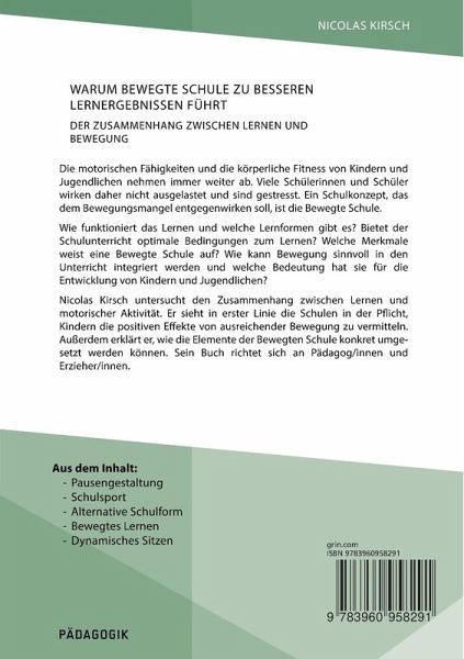Die motorischen Fähigkeiten und die körperliche Fitness von Kindern und Jugendlichen nehmen immer weiter ab. Viele Schülerinnen und Schüler wirken daher nicht ausgelastet und sind gestresst. Ein Schulkonzept, das dem Bewegungsmangel entgegenwirken soll, ist die Bewegte Schule. Wie funktioniert das Lernen und welche Lernformen gibt es? Bietet der Schulunterricht optimale Bedingungen zum Lernen? Welche Merkmale weist eine Bewegte Schule auf? Wie kann Bewegung sinnvoll in den Unterricht integriert werden und welche Bedeutung hat sie für die Entwicklung von Kindern und Jugendlichen? Nicolas Kirsch untersucht den Zusammenhang zwischen Lernen und motorischer Aktivität. Er sieht in erster Linie die Schulen in der Pflicht, Kindern die positiven Effekte von ausreichender Bewegung zu vermitteln. Außerdem erklärt er, wie die Elemente der Bewegten Schule konkret umgesetzt werden können. Sein Buch richtet sich an Pädagog/innen und Erzieher/innen. Aus dem Inhalt:-Pausengestaltung;-Schulsport;-Alternative Schulform;-Bewegtes Lernen;-Dynamisches Sitzen
