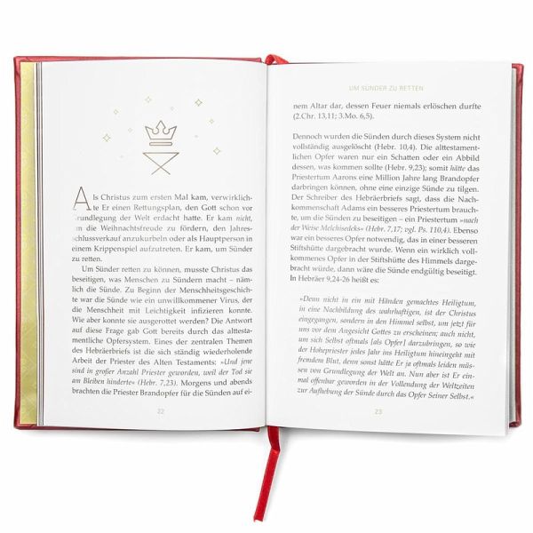 Wenn wir über die Geburt Christi nachdenken, richten wir unsere Aufmerksamkeit oft auf den detaillierten Bericht des Lukas-Evangeliums. Aber um den Hauptpunkt der Geschichte zu verstehen - nämlich, dass der ewige Sohn Gottes unsere menschliche Natur aus Fleisch und Blut angenommen hat -, müssen wir aus der gesamten Bibel lernen, warum Christus wirklich auf die Erde kam. Warum ist Christus gekommen? Diese 31 Antworten ermutigen Dich, die Geburt Christi tiefgründiger zu verstehen und klarer zu sehen, wie sie mit Seinem gesamten Wirken verbunden ist, und Du kannst ihre Bedeutung für Dein Leben begreifen. »Warum Christus kam« eignet sich gut für Familienandachten oder für die persönliche Stille Zeit - nicht nur in der Adventszeit. Mit einem Einband aus Kunstleder und mit Goldprägung und einem wunderschönen Design ist dies ein perfektes Geschenk für geliebte Menschen.