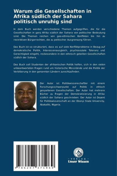 In dem Buch werden verschiedene Themen aufgegriffen, die für die Gesellschaften in ganz Afrika südlich der Sahara von politischer Bedeutung sind. Die Themen reichen von geo-ethnischen Konflikten bis hin zu restriktiven Bürgerrechten, die zu politischer Ausgrenzung führen.Das Buch ist so strukturiert, dass es auf viele Konfliktprobleme in Bezug auf demokratische Politik, Interessenausgleich, psychosoziale Toleranz und Gerechtigkeit eingeht, insbesondere in den ethnisch geteilten Gesellschaften südlich der Sahara.Das Buch soll Studenten der afrikanischen Politik helfen, sich in den vielen unbeantworteten Fragen rund um historische Missstände und die Politik der Verbitterung in den genannten Ländern zurechtzufinden.