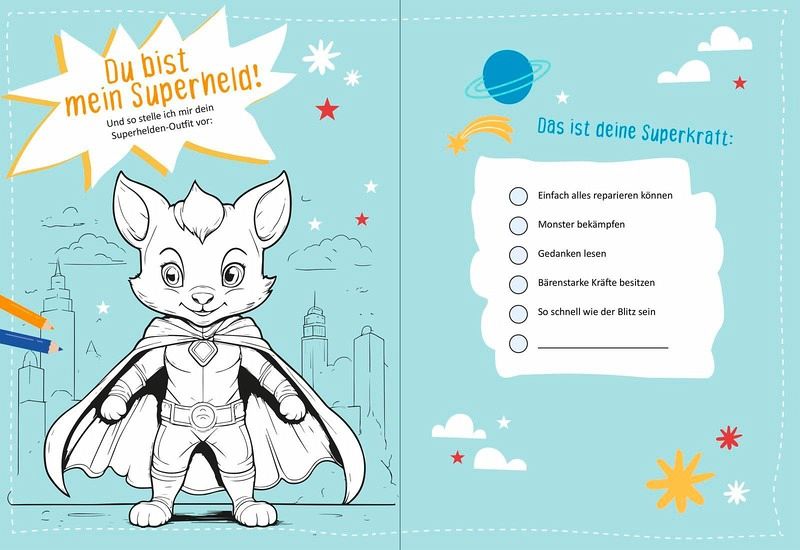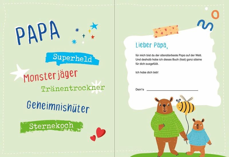 Fröhlich bunte Illustrationen sorgen für viel Spaß beim Ausfüllen und abwechslungsreiche und konkrete Aufgabenstellungen leiten beim Ausfüllen durch das BuchMit Seiten zum Ausfüllen z.B. Das mag ich besonders an dir, mit Seiten zum Malen und Basteln, z.B. mein Handabdruck + dein Handabdruck und viel Platz für FotosEine tolle Erinnerung an die Kindheit und Kinderzeit, perfekt für Geburtstag, Vatertag oder Weihnachten