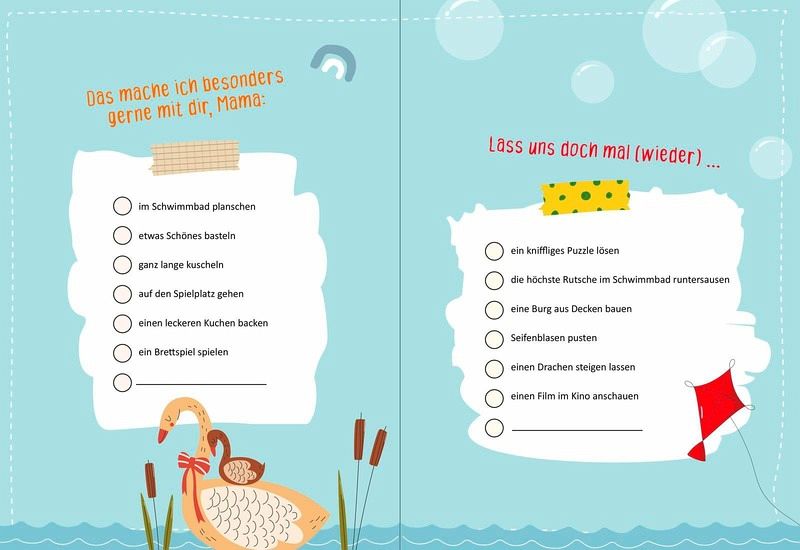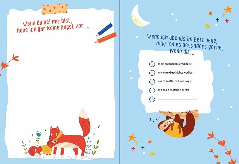 Fröhlich bunte Illustrationen sorgen für viel Spaß beim Ausfüllen und abwechslungsreiche und konkrete Aufgabenstellungen leiten beim Ausfüllen durch das BuchMit Seiten zum Ausfüllen z.B. Das mag ich besonders an dir, mit Seiten zum Malen und Basteln, z.B. mein Handabdruck + dein Handabdruck und viel Platz für Fotos