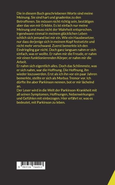 Die in diesem Buch geschriebenen Worte sind meine Meinung. Sie sind hart und gnadenlos zu den Betroffenen. Sie müssen nicht richtig sein, bestätigen aber das von mir Erlebte. Es ist einfach nur meine Meinung und muss nicht der Wahrheit entsprechen. Irgendwann einmal in meinem glücklichen Leben schlich sich jemand bei mir ein. Wie ein Hausbesetzer, nur dass derjenige sich in meinem Kopf festsetzte und nicht mehr verschwand. Zuerst bemerkte ich den Eindringling gar nicht. Doch ganz langsam nahm er sich einfach, was er wollte. Er nahm mir die Freude, er nahm mir einen funktionierenden Körper, er nahm mir die Arbeit.Er nahm sich eigentlich alles. Doch das Schlimmste, was er sich nahm, war die Hoffnung. Die Hoffnung, ihn wieder loszuwerden. Erst als ich ihn vor ein paar Jahren bemerkte, stellte er sich als Morbus Tremor vor. Ich dürfte ihn aber Parkinson nennen, bot er mir lächelnd an.Der Leser wird in die Welt der Parkinson-Krankheit mit all seinen Symptomen, Hoffnungen, Nebenwirkungen und Gefühlen mit einbezogen. Hier erfährt er, was es bedeutet, mit Parkinson zu leben.