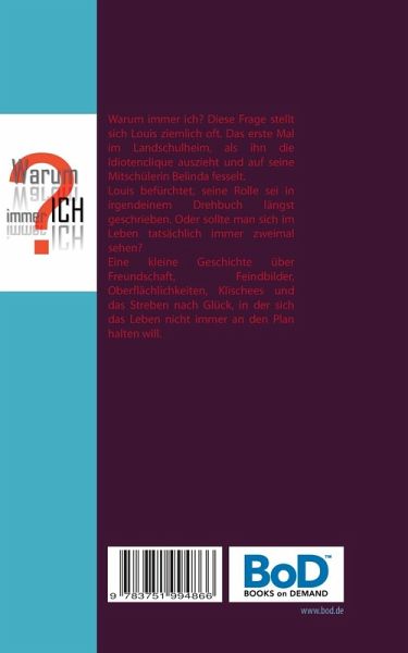 Warum immer ich? Diese Frage stellt sich Louis ziemlich oft. Das erste Mal im Landschulheim, als ihn die Idiotenclique auszieht und auf seine Mitschülerin Belinda fesselt. Louis befürchtet, seine Rolle sei in irgendeinem Drehbuch längst geschrieben. Oder sollte man sich im Leben tatsächlich immer zweimal sehen?Eine kleine Geschichte über Freundschaft, Feindbilder, Oberflächlichkeiten, Klischees und das Streben nach Glück, in der sich das Leben nicht immer an den Plan halten will.