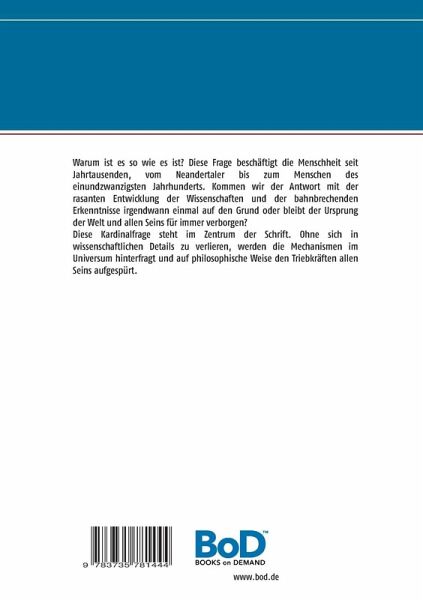 Warum ist es so wie es ist? Diese Frage beschäftigt die Menschheit seit Jahrtausenden, vom Neandertaler bis zum Menschen des einundzwanzigsten Jahrhunderts. Kommen wir der Antwort mit der rasanten Entwicklung der Wissenschaften und der bahnbrechenden Erkenntnisse irgendwann einmal auf den Grund oder bleibt der Ursprung der Welt und allen Seins für immer verborgen?Diese Kardinalfrage steht im Zentrum der Schrift. Ohne sich in wissenschaftlichen Details zu verlieren, werden die Mechanismen im Universum hinterfragt und auf philosophische Weise den Triebkräften allen Seins aufgespürt.