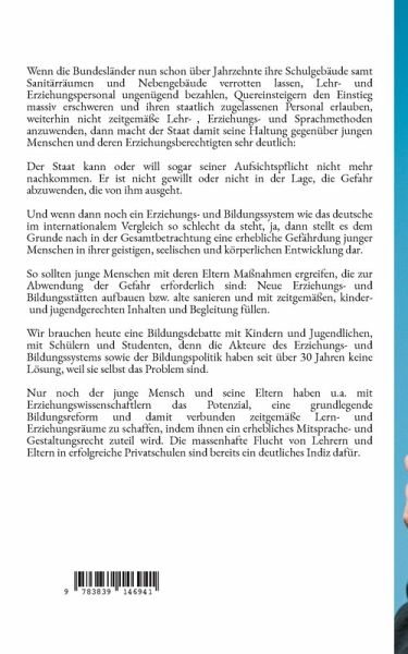 Wenn die Bundesländer nun schon über Jahrzehnte ihre Schulgebäude samt Sanitärräumen und Nebengebäude verrotten lassen, Lehr- und Erziehungspersonal ungenügend bezahlen, Quereinsteigern den Einstieg massiv erschweren und ihrem staatlich zugelassenen Personal erlauben, weiterhin nicht zeitgemäße Lehr-, Erziehungs- und Sprachmethoden anzuwenden, dann macht der Staat damit seine Haltung gegenüber jungen Menschen und deren Erziehungsberechtigten sehr deutlich: Der Staat kann oder will sogar seiner Aufsichtspflicht nicht mehr nachkommen. Er ist nicht gewillt oder nicht in der Lage, die Gefahr abzuwenden, die von ihm ausgeht. Und wenn dann noch ein Erziehungs- und Bildungssystem wie das deutsche im internationalen Vergleich so schlecht dasteht, ja, dann stellt es dem Grunde nach in der Gesamtbetrachtung eine erhebliche Gefährdung junger Menschen in ihrer geistigen, seelischen und körperlichen Entwicklung dar. So sollten junge Menschen mit deren Eltern Maßnahmen ergreifen, die zur Abwendung der Gefahr erforderlich sind: Neue Erziehungs- und Bildungsstätten aufbauen bzw. alte sanieren und mit zeitgemäßen, kinder- und jugendgerechten Inhalten und Begleitung füllen. Wir brauchen heute eine Bildungsdebatte mit Kindern und Jugendlichen, mit Schülern und Studenten, denn die Akteure des Erziehungs- und Bildungssystems sowie der Bildungspolitik haben seit über 30 Jahren keine Lösung, weil sie selbst das Problem sind. Nur noch der junge Mensch und seine Eltern haben u.a. mit Erziehungswissenschaftlern das Potenzial, eine grundlegende Bildungsreform und damit verbunden zeitgemäße Lern- und Erziehungsräume zu schaffen, indem ihnen ein erhebliches Mitsprache- und Gestaltungsrecht zuteilwird. Die massenhafte Flucht von Lehrern und Eltern in erfolgreiche Privatschulen sind bereits ein deutliches Indiz dafür.