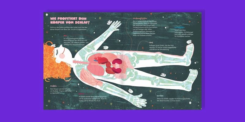 Autorin Cathy Evans verpackt die wissenschaftlichen Hintergründe der Nachtruhe und jede Menge lustige Fakten in kindgerechte Texthäppchen. Jedoch gibt es nicht nur viel Wissen zu entdecken, denn Illustratorin Polya Plavinskaia bezaubert kleine Leserinnen und Leser auch mit ihren vielschichtigen Illustrationen im Collage-Stil. Ein informatives, einladendes Buch, das sich ideal für alle eignet, die wissen wollen, wieso sie denn eigentlich jeden Abend so früh ins Bett müssen.