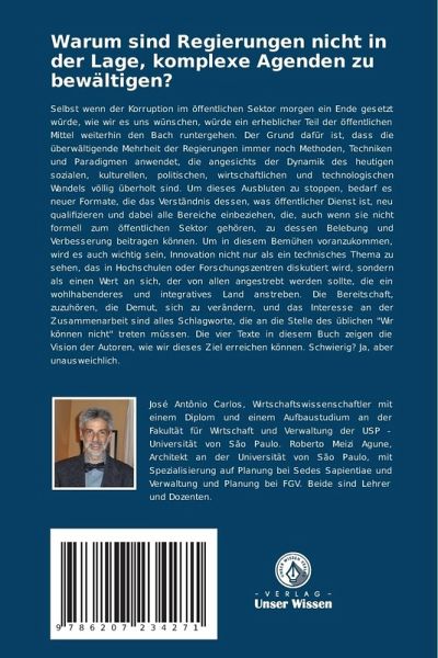 Selbst wenn der Korruption im öffentlichen Sektor morgen ein Ende gesetzt würde, wie wir es uns wünschen, würde ein erheblicher Teil der öffentlichen Mittel weiterhin den Bach runtergehen. Der Grund dafür ist, dass die überwältigende Mehrheit der Regierungen immer noch Methoden, Techniken und Paradigmen anwendet, die angesichts der Dynamik des heutigen sozialen, kulturellen, politischen, wirtschaftlichen und technologischen Wandels völlig überholt sind. Um dieses Ausbluten zu stoppen, bedarf es neuer Formate, die das Verständnis dessen, was öffentlicher Dienst ist, neu qualifizieren und dabei alle Bereiche einbeziehen, die, auch wenn sie nicht formell zum öffentlichen Sektor gehören, zu dessen Belebung und Verbesserung beitragen können. Um in diesem Bemühen voranzukommen, wird es auch wichtig sein, Innovation nicht nur als ein technisches Thema zu sehen, das in Hochschulen oder Forschungszentren diskutiert wird, sondern als einen Wert an sich, der von allen angestrebt werden sollte, die ein wohlhabenderes und integratives Land anstreben. Die Bereitschaft, zuzuhören, die Demut, sich zu verändern, und das Interesse an der Zusammenarbeit sind alles Schlagworte, die an die Stelle des üblichen "Wir können nicht" treten müssen. Die vier Texte in diesem Buch zeigen die Vision der Autoren, wie wir dieses Ziel erreichen können. Schwierig? Ja, aber unausweichlich.