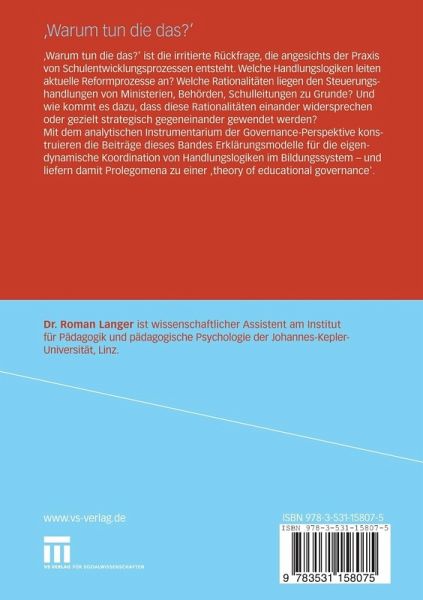 "Warum tun die das?" ist die irritierte Rückfrage, die angesichts der Praxis von Schulentwicklungsprozessen entsteht. Welche Handlungslogiken leiten aktuelle Reformprozesse an? Welche Rationalitäten liegen den Steuerungshandlungen von Ministerien, Behörden, Schulleitungen zu Grunde? Und wie kommt es dazu, dass diese Rationalitäten einander widersprechen oder gezielt strategisch gegeneinander gewendet werden? Mit dem analytischen Instrumentarium der Governance-Perspektive konstruieren die Beiträge dieses Bandes Erklärungsmodelle für die eigendynamische Koordination von Handlungslogiken im Bildungssystem - und liefern damit Prolegomena zu einer 'theory of educational governance'.
