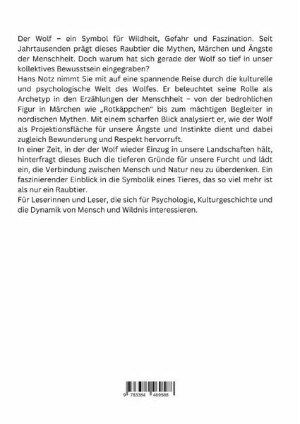 Der Wolf - ein Symbol für Wildheit, Gefahr und Faszination. Seit Jahrtausenden prägt dieses Raubtier die Mythen, Märchen und Ängste der Menschheit. Doch warum hat sich gerade der Wolf so tief in unser kollektives Bewusstsein eingegraben?Hans Notz nimmt Sie mit auf eine spannende Reise durch die kulturelle und psychologische Welt des Wolfes. Er beleuchtet seine Rolle als Archetyp in den Erzählungen der Menschheit - von der bedrohlichen Figur in Märchen wie "Rotkäppchen" bis zum mächtigen Begleiter in nordischen Mythen. Mit einem scharfen Blick analysiert er, wie der Wolf als Projektionsfläche für unsere Ängste und Instinkte dient und dabei zugleich Bewunderung und Respekt hervorruft.In einer Zeit, in der der Wolf wieder Einzug in unsere Landschaften hält, hinterfragt dieses Buch die tieferen Gründe für unsere Furcht und lädt ein, die Verbindung zwischen Mensch und Natur neu zu überdenken. Ein faszinierender Einblick in die Symbolik eines Tieres, das so viel mehr ist als nur ein Raubtier.Für Leserinnen und Leser, die sich für Psychologie, Kulturgeschichte und die Dynamik von Mensch und Wildnis interessieren.