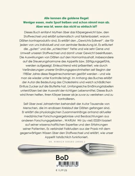 Alle kennen die goldene Regel: Weniger essen, mehr Sport treiben und schon nimmt man ab. Aber was ist, wenn das nicht so einfach ist?Dieses Buch entlarvt Mythen über das Körpergewicht bzw. den Stoffwechsel und erklärt systematisch und faktenbasiert, warum Diäten kontraproduktiv sind. Es erklärt den "Gewichts-Sollwert", der für jeden von uns individuell und von zentraler Bedeutung ist. Es erläutert die "guten" und die "schlechten" Fette und wie sehr Gene und Umwelt unseren Stoffwechsel und damit unser Gewicht beeinflussen. Die Auswirkungen von Diäten auf den Hormonhaushalt, insbesondere auf die Steuerungshormone des Appetits bzw. Sättigungsgefühls, werden aufgezeigt. Einleuchtend wird präsentiert, wie durch Veränderungen unserer Ernährungsgewohnheiten seit Beginn der 1980er Jahre diese Regelmechanismen gestört werden - und wie man sie wieder unter Kontrolle bringt. Im Anhang des Buches erklärt der Autor die Bedeutung des Cholesterins und welch schädlichen Einfluss Zucker auf die Blutfette hat. Umfangreiche Ernährungstabellen unterstützen bei der Auswahl der richtigen Lebensmittel. Dieses Buch wird Ihnen helfen, Ihren Körper besser als je zuvor zu verstehen und zu kontrollieren. Seit über zwei Jahrzehnten behandelt der Autor Tausende von Menschen, die im endlosen Kreislauf der Diäten gefangen sind. Er erklärt die physiologischen Zusammenhänge anhand aktueller medizinischer Forschungsergebnisse und Beobachtungen aus anderen Forschungsgebieten . WARUM Wir (zu viel) ESSEN basiert auf seiner wissenschaftlichen Expertise und den Erfahrungen seiner Patienten. Es verbindet Fallstudien aus der Praxis mit dem gegenwärtigen Wissen über den Stoffwechsel und erklärt, wie unser Appetit tatsächlich funktioniert.