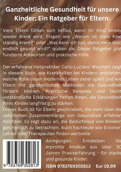 Ganzheitliche Gesundheit für unsere Kinder: Ein Ratgeber für Eltern. Viele Eltern fühlen sich hilflos, wenn ihr Kind immer wieder krank wird. Fragen wie »Warum ist mein Kind ständig krank?« oder »Was kann ich tun, damit mein Kind endlich gesund wird?« quälen sie. Dieser Ratgeber gibt fundierte Antworten und praktische Hilfe. Der erfahrene Heilpraktiker Carlo Luciano Weichert zeigt in diesem Buch, wie Krankheiten bei Kindern entstehen, welche Rolle unser modernes Leben dabei spielt und wie Eltern mit ganzheitlichen Methoden die Gesundheit fördern können. Praktische Beispiele und leicht verständliche Erklärungen helfen Ihnen, die Gesundheit Ihres Kindes langfristig zu stärken. Dieses Buch ist für Eltern geschrieben, die mehr über die natürlichen Zusammenhänge von Gesundheit erfahren möchten. Es regt dazu an, die Bedürfnisse von Kindern ganzheitlich zu betrachten. Auch Fachleute wie Erzieher, Lehrer oder Therapeuten finden wertvolle Anregungen. Entdecken Sie erprobte Ansätze aus über 30 Jahren Praxiserfahrung - für starke und gesunde Kinder. Ein umfassender Einblick in die Herausforderungen und Lösungen der Kindergesundheit. Kinder sind das Kostbarste, was wir haben, doch viele Eltern stehen vor großen Herausforderungen, wenn es um die Gesundheit ihrer Kleinen geht. Dieses Buch beleuchtet Themen wie Gesundheit und Krankheiten bei Kindern und zeigt, wie häufige Beschwerden wie Bauchweh, Darmprobleme, Fieber, Mittelohrentzündungen oder Hals-Rachen-Entzündungen ganzheitlich behandelt werden können. Besonderes Augenmerk wird auf den Umgang mit Antibiotikaproblemen gelegt, die durch Antibiotikaresistenz oft kompliziert werden. Der Ratgeber erklärt, wann Antibiotika wirklich notwendig sind und welche alternativen Ansätze Eltern in Betracht ziehen können. Stärken Sie die Abwehrkräfte Ihres Kindes. Lernen Sie, wie Sie häufige Beschwerden wie Bauchweh, Fieber und Mittelohrentzündungen auf natürliche Weise lindern können. Fundierte Hilfe bei Antibiotikaproblemen. Verstehen Sie die Ursachen von Antibiotikastörungen und erfahren Sie, wie Sie Antibiotikaresistenz vorbeugen und alternative Heilmethoden nutzen können. Ratgeber: Ob Eltern, Erzieher oder Therapeuten: Dieses Buch bietet wertvolle Einsichten zur Kindergesundheit und gibt Antworten auf drängende Fragen zu Impfen und Kinderkrankheiten.