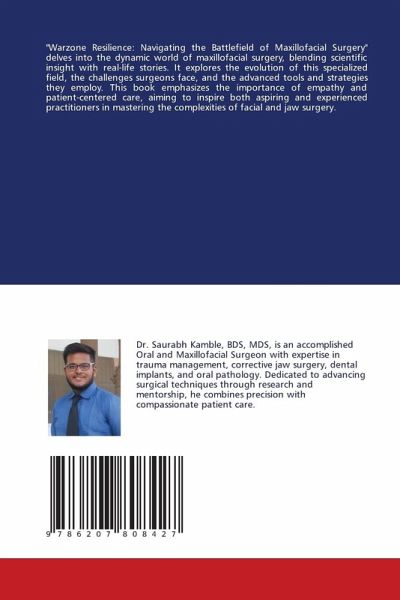 "Warzone Resilience: Navigating the Battlefield of Maxillofacial Surgery" delves into the dynamic world of maxillofacial surgery, blending scientific insight with real-life stories. It explores the evolution of this specialized field, the challenges surgeons face, and the advanced tools and strategies they employ. This book emphasizes the importance of empathy and patient-centered care, aiming to inspire both aspiring and experienced practitioners in mastering the complexities of facial and jaw surgery.