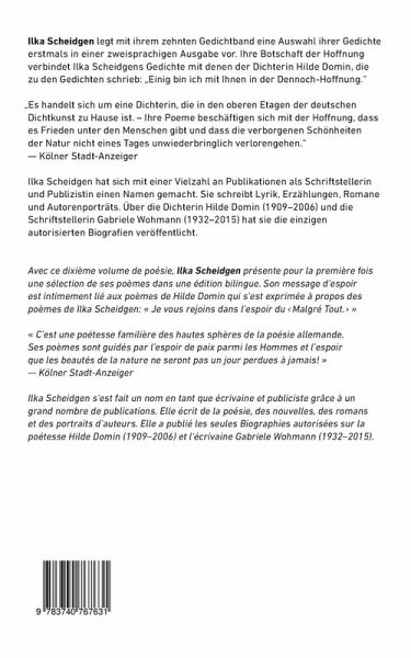 Ilka Scheidgen legt mit ihrem zehnten Gedichtband eine Auswahl ihrer Gedichte erstmals in einer zweisprachigen Ausgabe vor. Ihre Botschaft der Hoffnung verbindet Ilka Scheidgens Gedichte mit denen der Dichterin Hilde Domin, die zu den Gedichten schrieb: Einig bin ich mit Ihnen in der Dennoch-Hoffnung.Der Lyriker Peter Rühmkorf zu Scheidgens Gedichten: Sie sind eine Meisterin der lyrischen Miniatur.Der Kölner Stadt-Anzeiger schreibt über Ilka Scheidgen:Es handelt sich um eine Dichterin, die in den oberen Etagen der deutschen Dichtkunst zu Hause ist. - Ihre Poeme beschäftigen sich mit der Hoffnung, dass es Frieden unter den Menschen gibt und dass die verborgenen Schönheiten der Natur nicht eines Tages unwiederbringlich verlorengehen.