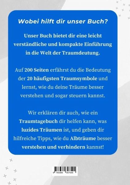 In unserem Buch erhältst du eine kompakte und leicht verständliche Einführung in die Welt der Traumdeutung. Auf 200 Seiten erklären wir die Bedeutung der häufigsten Traumsymbole, zeigen dir, wie du deine Träume beeinflussen kannst, und geben wertvolle Tipps zum Führen eines Traumtagebuchs. Wir erklären dir auch, wie ein Traumtagebuch dir helfen kann, was luzides Träumen ist, und geben dir hilfreiche Tipps, wie du Albträume besser verstehen und verhindern kannst! Perfekt für alle, die ihre nächtlichen Erlebnisse besser verstehen und nutzen wollen.