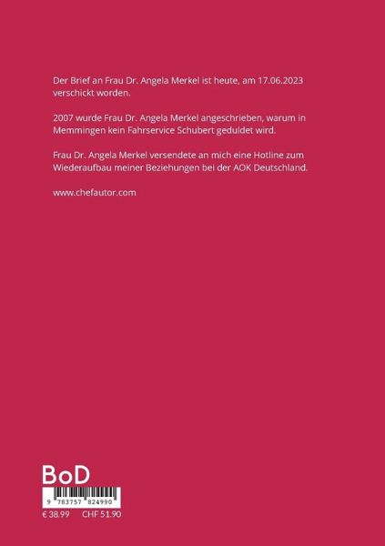 Der Brief an Frau Dr. Angela Merkel ist heute, am 17.06.2023 verschickt worden.2007 wurde Frau Dr. Angela Merkel angeschrieben, warum in Memmingen kein Fahrservice Schubert geduldet wird.Frau Dr. Angela Merkel versendete an mich eine Hotline zum Wiederaufbau meiner Beziehungen bei der AOK Deutschland.www.chefautor.com