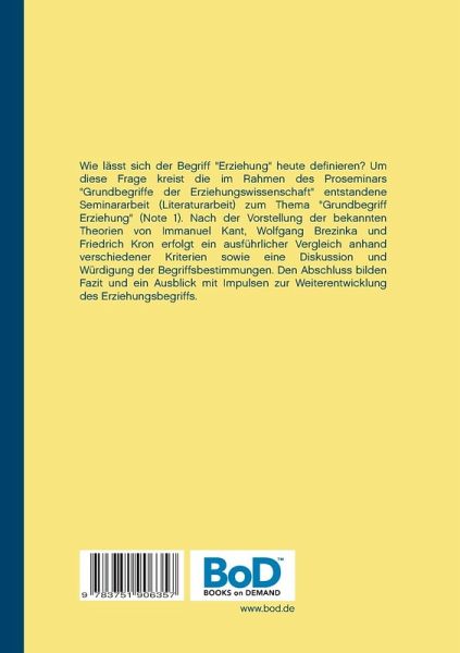 Wie lässt sich der Begriff "Erziehung" heute definieren? Um diese Frage kreist die im Rahmen des Proseminars "Grundbegriffe der Erziehungswissenschaft" entstandene Seminararbeit (Literaturarbeit) zum Thema "Grundbegriff Erziehung" (Note 1). Nach der Vorstellung der bekannten Theorien von Immanuel Kant, Wolfgang Brezinka und Friedrich Kron erfolgt ein ausführlicher Vergleich anhand verschiedener Kriterien sowie eine Diskussion und Würdigung der Begriffsbestimmungen. Den Abschluss bilden Fazit und ein Ausblick mit Impulsen zur Weiterentwicklung des Erziehungsbegriffs.