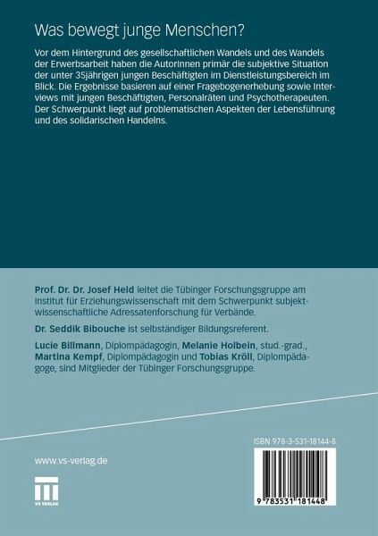 Vor dem Hintergrund des gesellschaftlichen Wandels und des Wandels der Erwerbsarbeit haben die AutorInnen primär die subjektive Situation der unter 35jährigen jungen Beschäftigten im Dienstleistungsbereich im Blick. Die Ergebnisse basieren auf einer Fragebogenerhebung sowie Interviews mit jungen Beschäftigten, Personalräten und Psychotherapeuten. Der Schwerpunkt liegt auf problematischen Aspekten der Lebensführung und des solidarischen Handelns.