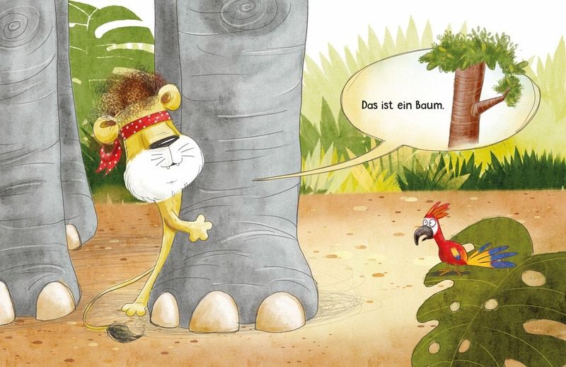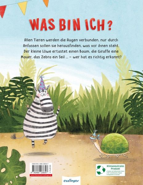 Geburtstagsparty beim kleinen Löwen. Mama und Papa Löwe haben ein tolles Spiel vorbereitet. "Was bin ich?" wird gefragt: Allen Tieren werden die Augen verbunden, nur durch Anfassen sollen sie herausfinden, was vor ihnen steht. Der kleine Löwe ertastet einen Baum, die Giraffe eine Mauer, das Nilpferd eine Schlange, das Krokodil einen Fächer, das Zebra ein Seil ... - wer hat es richtig erkannt?