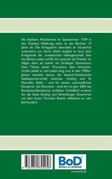 Als Adalbert Mischlewski im Spätsommer 1939 in den Zweiten Weltkrieg zieht, ist der Berliner 19 Jahre alt. Die Kriegsjahre übersteht er in Dänemark, Frankreich, den Niederlanden und dem damaligen Protektorat Böhmen und Mähren körperlich unversehrt. Nur durch Glück entgeht er kurz nach Kriegsende der sowjetischen Gefangenschaft. Er studiert an der Ludwigs-Maximilians-Universität in München und am Campo Santo im Vatikan. Sein berufliches Leben erfüllt ihn zunächst als Priester im Allgäu, dann als Lehrer am Grafinger Gymnasium. Dem Thema seiner Promotion, dem Antoniter-Orden, bleibt er sein Leben lang treu. In den 1990er-Jahren entsteht daraus die deutsch-französische Städtepartnerschaft zwischen Grafing und St. Marcellin. Dafür, und für seinen unermüdlichen Einsatz für die Ökumene wird ihm im Jahr 2005 das Bundesverdienstkreuz verliehen. Schließlich ernennt ihn die Stadt Grafing zum Ehrenbürger. Zusammen mit dem Autor Thorsten Rienth reflektiert er sein Jahrhundert.