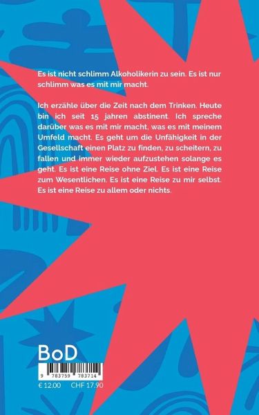 Ich erzähle über die Zeit nach dem Trinken. Heute bin ich seit 11 Jahren abstinent. Ich spreche darüber was es mit mir macht, was es mit meinem Umfeld macht. Es geht um die Unfähigkeit, in der Gesellschaft einen Platz zu finden, zu scheitern, zu fallen und immer wieder aufzustehen, solange es geht. Es ist eine Reise ohne Ziel. Es ist eine Reise zum Wesentlichen. Es ist eine Reise zu mir selbst. Es ist eine Reise zu allem oder nichts.