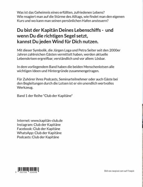 Was ist das Geheimnis eines erfüllten, zufriedenen Lebens? Wie reagiert man auf die Stürme des Alltags, wie findet man den eigenen Kurs und wo kann man seinen persönlichen Hafen ansteuern?Du bist der Kapitän Deines Lebenschiffes - und wenn Du die richtigen Segel setzt, kannst Du jeden Wind für Dich nutzen!Mit dieser Symbolik, die Jürgen Loga und Petra Seiter seit den 2000er Jahren zahlreichen Gästen vermittelt haben, werden aktuelle Lebenskrisen ergreifbar, verständlich und vor allem: Lösbar.In diesem Band haben die beiden Menschenlotsen Jürgen Loga und Petra Seiter die ganzen Ideen und Hintergründe zusammengetragen. Für Zuhörer ihres Podcasts, Seminarteilnehmer oder auch Gäste bei den Begleitungen durch die Lotsen ist er ein unendlich wertvolles Werkzeug.