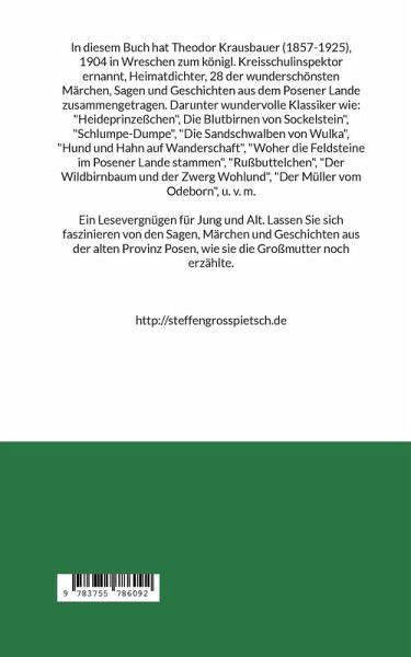 In diesem Band hat Theodor Krausbauer (1857-1925), 1904 in Wreschen zum Königl. Kreisschulinspektor ernannt, Heimatdichter, 28 der wunderschönsten Märchen, Sagen und Geschichten aus dem Posener Lande zusammengetragen. Darunter wundervolle Klassiker wie: "Heideprinzeßchen", "Die Blutbirnen von Sockelstein", "Schlumpe-Dumpe", "Die Sandschwalben von Wulka", "Hund und Hahn auf Wanderschaft", "Woher die Feldsteine im Posener Lande stammen", "Der Wildbirnbaum und der Zwerg Wohlund", "Rußbuttelchen", "Der Müller vom Odeborn", u. v. m.Ein Lesevergnügen für Jung und Alt.