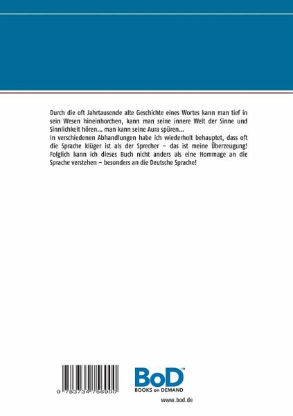 Durch die oft Jahrtausende alte Geschichte eines Wortes kann man tief in sein Wesen hineinhorchen, kann man seine innere Welt der Sinne und Sinnlichkeit hören... man kann seine Aura spüren...In verschiedenen Abhandlungen habe ich wiederholt behauptet, dass oft die Sprache klüger ist als der Sprecher - das ist meine Überzeugung! Folglich kann ich dieses Buch nicht anders als eine Hommage an die Sprache verstehen - besonders an die Deutsche Sprache!