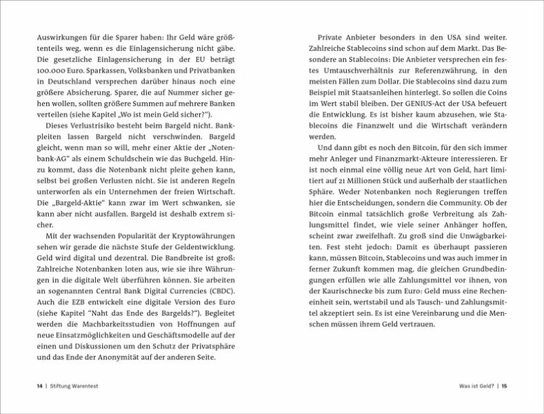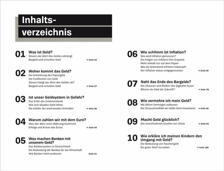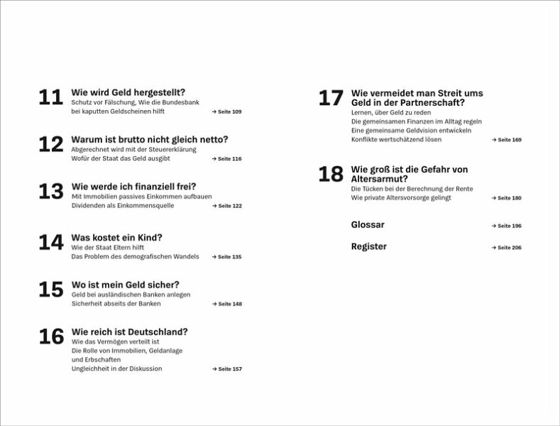 18 kompakte Kapitel bieten einen umfassenden Überblick über unser Geldsystem - von den historischen Grundlagen über aktuelle Entwicklungen rund um Bitcoin und Co. bis hin zu ganz persönlichen Finanzthemen wie Altersvorsorge oder dem Umgang mit Geld in der Partnerschaft.