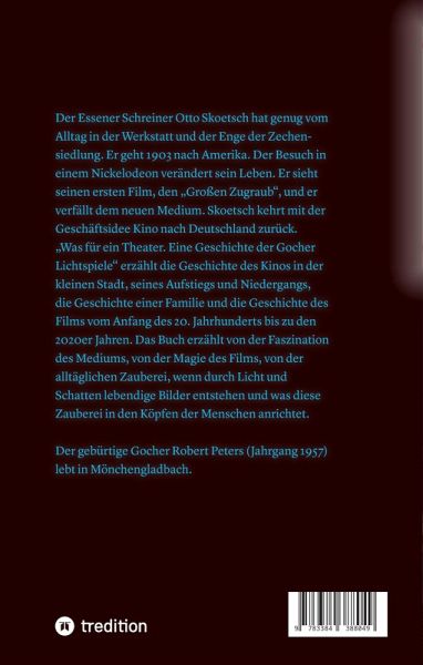 Das Buch "Was für ein Theater" erzählt die Geschichte des Kinos aus der Perspektive von Otto Skoetsch. Der Essener Schreiner hat genug vom Alltag in der Werkstatt und der Enge der Zechensiedlung, in der er mit seinen Eltern lebt, die aus Masuren eingewandert sind. Er geht 1903 nach Amerika. In New York arbeitet er auf dem Bau. Der Besuch in einem Nickelodeon verändert sein Leben. Er sieht seinen ersten Film, den "Großen Eisenbahnraub", und er verfällt dem neuen Medium. Skoetsch kehrt mit der Geschäftsidee Kino nach Deutschland zurück. "Was für ein Theater. Eine Geschichte der Gocher Lichtspiele" erzählt vom Kino in der kleinen Stadt, seinem Aufstieg und seinem Niedergang. Erzählt wird Geschichte einer Familie und die Geschichte des Films vom Anfang des 20. Jahrhunderts bis zu den 2020er Jahren. Das Buchspürt der Faszination des Mediums nach, der Magie des Films, der alltäglichen Zauberei, wenn durch Licht und Schatten lebendige Bilder entstehen und was diese Zauberei in den Köpfen der Menschen anrichtet.