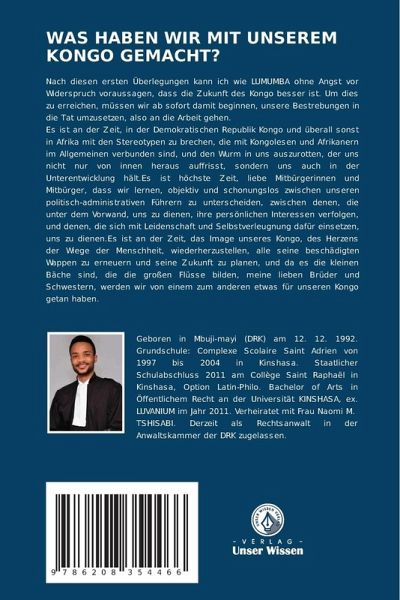 Nach diesen ersten Überlegungen kann ich wie LUMUMBA ohne Angst vor Widerspruch voraussagen, dass die Zukunft des Kongo besser ist. Um dies zu erreichen, müssen wir ab sofort damit beginnen, unsere Bestrebungen in die Tat umzusetzen, also an die Arbeit gehen.Es ist an der Zeit, in der Demokratischen Republik Kongo und überall sonst in Afrika mit den Stereotypen zu brechen, die mit Kongolesen und Afrikanern im Allgemeinen verbunden sind, und den Wurm in uns auszurotten, der uns nicht nur von innen heraus auffrisst, sondern uns auch in der Unterentwicklung hält.Es ist höchste Zeit, liebe Mitbürgerinnen und Mitbürger, dass wir lernen, objektiv und schonungslos zwischen unseren politisch-administrativen Führern zu unterscheiden, zwischen denen, die unter dem Vorwand, uns zu dienen, ihre persönlichen Interessen verfolgen, und denen, die sich mit Leidenschaft und Selbstverleugnung dafür einsetzen, uns zu dienen.Es ist an der Zeit, das Image unseres Kongo, des Herzens der Wiege der Menschheit, wiederherzustellen, alle seine beschädigten Wappen zu erneuern und seine Zukunft zu planen, und da es die kleinen Bäche sind, die die großen Flüsse bilden, meine lieben Brüder und Schwestern, werden wir von einem zum anderen etwas für unseren Kongo getan haben.