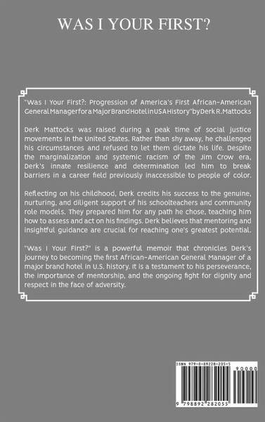 "Was I Your First?: Progression of America's First African-American General Manager for a Major Brand Hotel in USA History" by Derk R. Mattocks Derk Mattocks was raised during a peak time of social justice movements in the United States. Rather than shy away, he challenged his circumstances and refused to let them dictate his life. Despite the marginalization and systemic racism of the Jim Crow era, Derk's innate resilience and determination led him to break barriers in a career field previously inaccessible to people of color. Reflecting on his childhood, Derk credits his success to the genuine, nurturing, and diligent support of his schoolteachers and community role models. They prepared him for any path he chose, teaching him how to assess and act on his findings. Derk believes that mentoring and insightful guidance are crucial for reaching one's greatest potential. "Was I Your First?" is a powerful memoir that chronicles Derk's journey to becoming the first African-American General Manager of a major brand hotel in U.S. history. It is a testament to his perseverance, the importance of mentorship, and the ongoing fight for dignity and respect in the face of adversity.