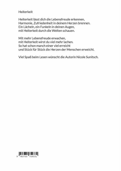 HeiterkeitHeiterkeit lässt dich die Lebensfreude erkennen, Harmonie, Zufriedenheit in deinem Herzen brennen.Ein Lächeln, ein Funkeln in deinen Augen,mit Heiterkeit durch die Welten schauen.Mit mehr Lebensfreude erwachen,mit Heiterkeit wirst du viel mehr lachen.So hat schon manch einer viel erreichtund Stück für Stück die Herzen der Menschen erweicht.Viel Spaß beim Lesen wünscht die Autorin Nicole Sunitsch.