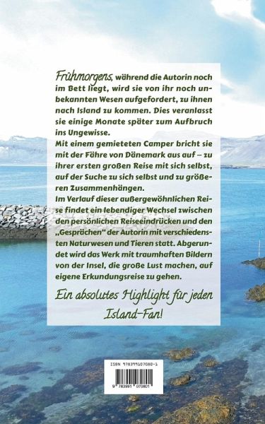 Frühmorgens, während die Autorin noch im Bett liegt, wird sie von ihr noch unbekannten Wesen aufgefordert, zu ihnen nach Island zu kommen. Dies veranlasst sie einige Monate später zum Aufbruch ins Ungewisse.Mit einem gemieteten Camper bricht sie mit der Fähre von Dänemark aus auf - zu ihrer ersten großen Reise mit sich selbst, auf der Suche zu sich selbst und zu größeren Zusammenhängen.Im Verlauf dieser außergewöhnlichen Reise findet ein lebendiger Wechsel zwischen den persönlichen Reiseeindrücken und den "Gesprächen" der Autorin mit verschiedensten Naturwesen und Tieren statt. Abgerundet wird das Werk mit traumhaften Bildern von der Insel, die große Lust machen, auf eigene Erkundungsreise zu gehen.Ein absolutes Highlight für jeden Island-Fan!