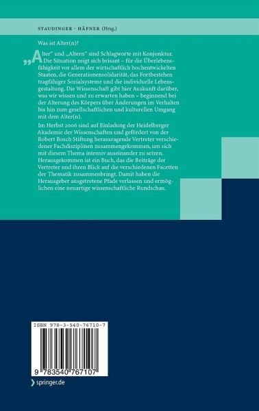 Was ist Alter(n): Körper.- Molekulare Mechanismen des Alterns Über das Altern der Zellen und den Einfluss von oxidativem Stress auf den Alternsprozess.- Was ist Alter? Ein Mensch ist so alt wie seine Stammzellen.- Altern ist auch adulte Neurogenese Neue Nervenzellen für alternde Gehirne.- Jugend ist Stärke und Alter ist Schwäche der Reparaturmechanismen.- Was ist Alter(n): Verhalten.- Was ist kognitives Altern? Begriffsbestimmung und Forschungstrends.- Was ist das Alter(n) der Persönlichkeit? Eine Antwort aus verhaltenswissenschaftlicher Sicht.- Was ist Alter(n): Gesellschaft und Politik.- Was ist demographische Alterung? Der Beitrag der Veränderungen der demographischen Parameter zur demographischen Alterung in den alten Bundesländern seit 1950.- Was meint Alter? was bewirkt demographisches Altern? Soziologische Perspektiven.- Was ist Alter? Die Perspektive der Politikwissenschaft.- Was ist Alter(n): Kultur und Bedeutungskonstruktion.- Das Alter in Geschichte und Geschichtswissenschaft.- Das Alter in der Literatur.- Bilder des Alters und des Alterns im Wandel.- Neuigkeiten über das Alter?.- Ausblick.- Chancen und Herausforderungen einer alternden Gesellschaft.
