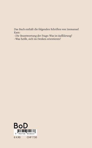 Das Buch enthält die folgenden Schriften von Immanuel Kant:-Die Beantwortung der Frage: Was ist Aufklärung?-Was heißt, sich im Denken orientieren?