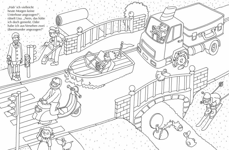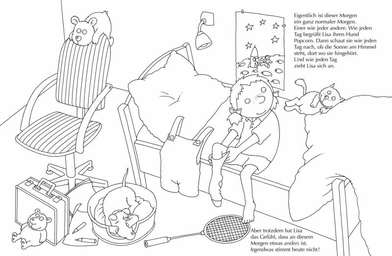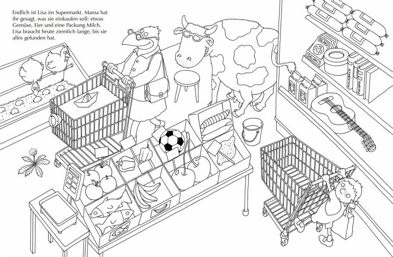 Ausmalen macht Kindern Spaß und Ralf Butschkows beliebte Suchspaß-Wimmelbücher begeistern ebenso. Deshalb gibt es jetzt das große Malbuch zu "Da stimmt doch was nicht!" und "Was stimmt denn da nicht?", in dem Lisa und ihr Hund Popcorn von lauter verrückten Dingen umgeben sind: Da stehen die Schuhe im Kühlschrank, im Einkaufswagen schwappt ein See. Und als Lisa zu ihren Großeltern auf den Bauernhof fährt, entdeckt sie sogar Schafe, die handgestrickte Pullover tragen. Also, irgendetwas stimmt da nicht! Zwei witzige Suchspaß-Geschichten zum Vorlesen, Rätseln und Ausmalen. Mit Schwarz-Weiß-Vorlagen und farbigen Stickern