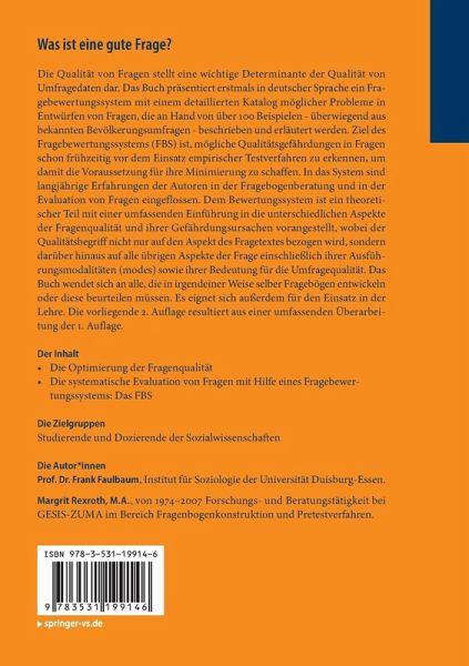 Die Qualität von Fragen stellt eine wichtige Determinante der Qualität von Umfragedaten dar. Das Buch präsentiert erstmals in deutscher Sprache ein Fragebewertungssystem mit einem detaillierten Katalog möglicher Probleme in Entwürfen von Fragen, die an Hand von über 100 Beispielen - überwiegend aus bekannten Bevölkerungsumfragen - beschrieben und erläutert werden. Ziel des Fragebewertungssystems (FBS) ist, mögliche Qualitätsgefährdungen in Fragen schon frühzeitig vor dem Einsatz empirischer Testverfahren zu erkennen, um damit die Voraussetzung für ihre Minimierung zu schaffen. In das System sind langjährige Erfahrungen der Autoren in der Fragebogenberatung und in der Evaluation von Fragen eingeflossen. Dem Bewertungssystem ist ein theoretischer Teil mit einer umfassenden Einführung in die unterschiedlichen Aspekte der Fragenqualität und ihrer Gefährdungsursachen vorangestellt, wobei der Qualitätsbegriff nicht nur auf den Aspekt des Fragetextes bezogen wird, sondern darüber hinausauf alle übrigen Aspekte der Frage einschließlich ihrer Ausführungsmodalitäten (modes) sowie ihrer Bedeutung für die Umfragequalität. Das Buch wendet sich an alle, die in irgendeiner Weise selber Fragebögen entwickeln oder diese beurteilen müssen. Es eignet sich außerdem für den Einsatz in der Lehre. Die vorliegende 2. Auflage resultiert aus einer umfassenden Überarbeitung der 1. Auflage.