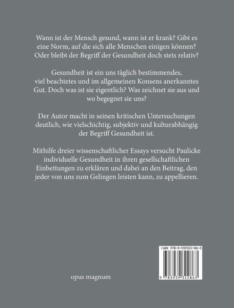 Wann ist der Mensch gesund, wann ist er krank? Gibt es eine Norm auf die sich alle Menschen einigen können? Oder bleibt der Begriff der Gesundheit doch stets relativ? Gesundheit ist ein uns täglich bestimmendes, viel beachtetes und im allgemeinen Konsens anerkanntes Gut. Doch was ist sie eigentlich? Was zeichnet sie aus und wo begegnet sie uns? Der Autor macht in seinen kritischen Untersuchungen deutlich, wie vielschichtig, subjektiv und kulturabhängig der Begriff Gesundheit ist. Mithilfe dreier wissenschaftlicher Essays versucht Paulicke individuelle Gesundheit in ihren gesellschaftlichen Einbettungen zu erklären und dabei an den Beitrag, den jeder von uns zum Gelingen leisten kann, zu appellieren.