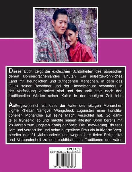 Dieses Buch zeigt die exotischen Schönheiten des Donnerdrachenlandes Bhutan mit dem jüngsten Königspaar der Welt, das sich für das Glück seiner freundlichen Bewohner, den Umweltschutz und die Verbindung von modernem Livestyle und buddhistischer Tradition der Väter einsetzt.