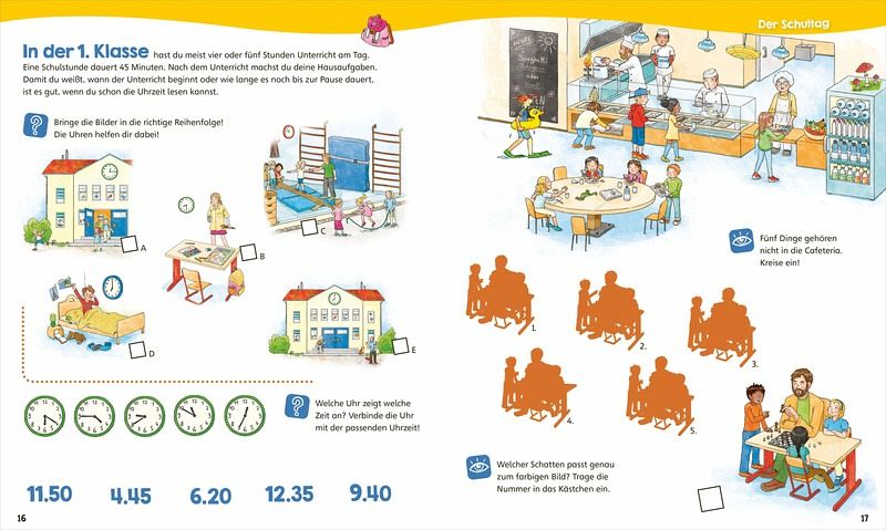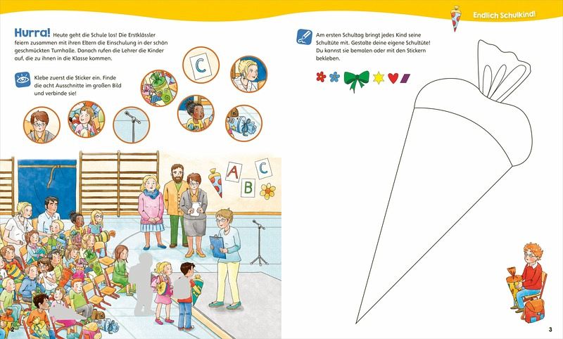 Der Schulranzen ist gepackt, die Schultüte gefüllt: Endlich geht die Schule los - wie aufregend! Mit diesem Mal- und Rätselheft erleben Kinder, wie ein typischer Schultag aussieht. Zwischendurch gibt es spannende Sudoku zu lösen, Zahlenbilder auszumalen und Labyrinthe zu durchqueren. Für zusätzlichen Spaß sorgen wiederablösbare Sticker und die kleine Erstlesegeschichte am Ende des Hefts, bei der einzelne Wörter durch Bilder ersetzt sind. Ganz spielerisch können Kinder ab 4 Jahren so alles üben, was sie für einen guten Start in die Schulzeit benötigen!