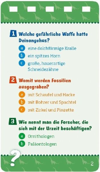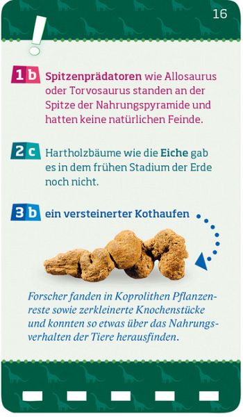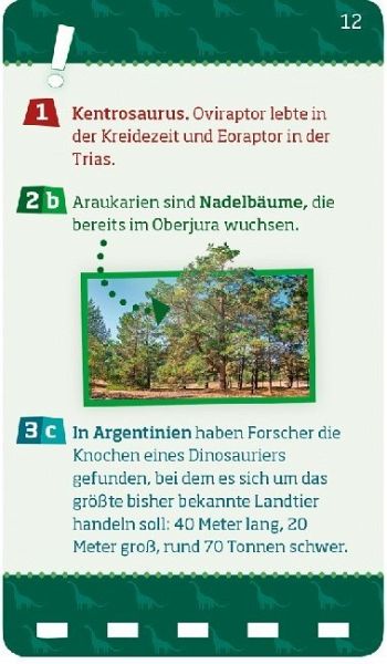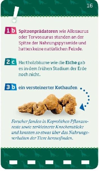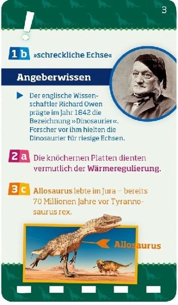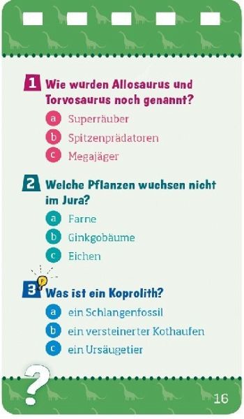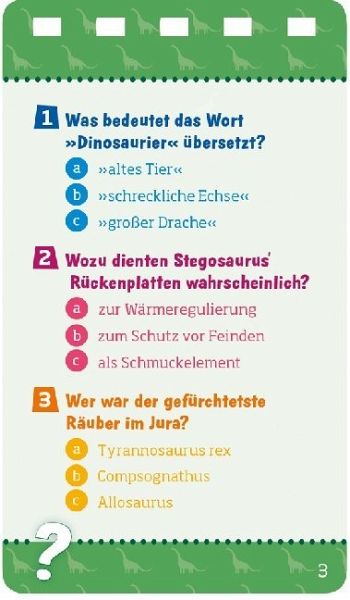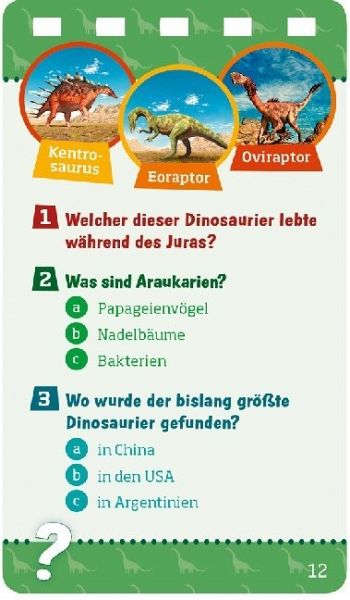 Brachiosaurus, Spinosaurus, Tyrannus Rex: Über 100 Fragen unterschiedlicher Schwierigkeitsstufen machen echte Dinosaurierfans im Handumdrehen noch schlauer! Das Quiz ist alleine oder in der Gruppe spielbar. Für Kinder ab 8 Jahren.