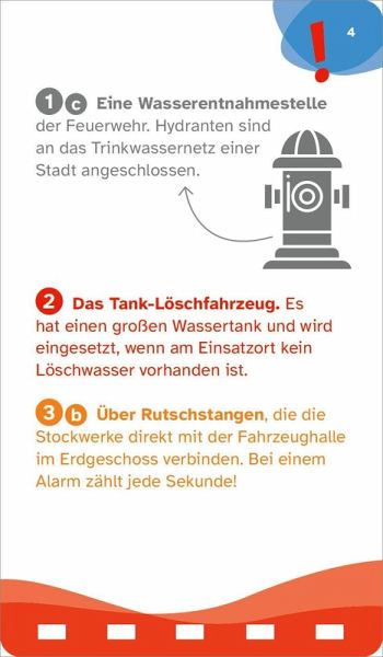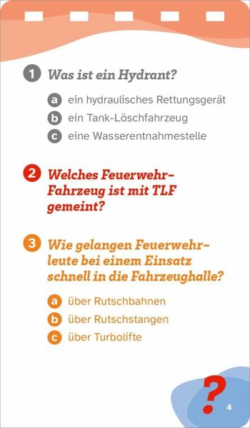Wie verständigen sich Feuerwehrleute im Einsatz? Welche Funktion haben die hohen Türme an einer Feuerwache? Aus wie vielen Leuten besteht ein Feuerwehrtrupp? Mit diesen und rund 100 weiteren Fragen quizzen sich Kinder durch die Welt der Feuerwehr. Egal, ob man alleine spielt oder sein Wissen mit anderen misst, der Quizblock liefert die perfekte Unterhaltung. Geeignet für Kinder ab 8 Jahren und erwachsene Feuerwehr-Fans.