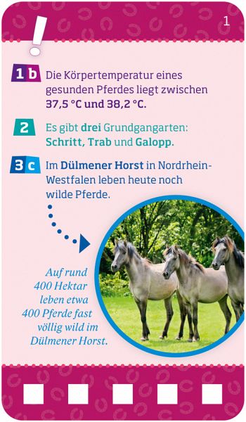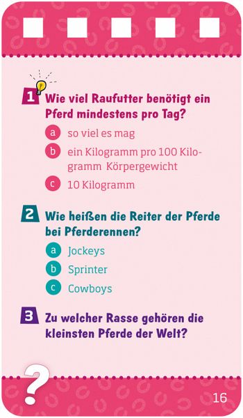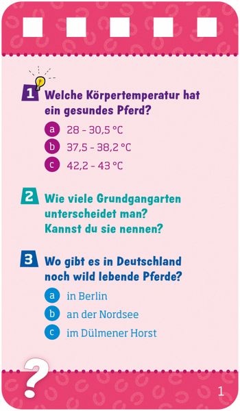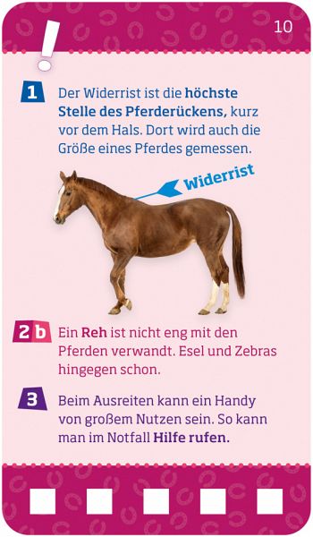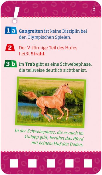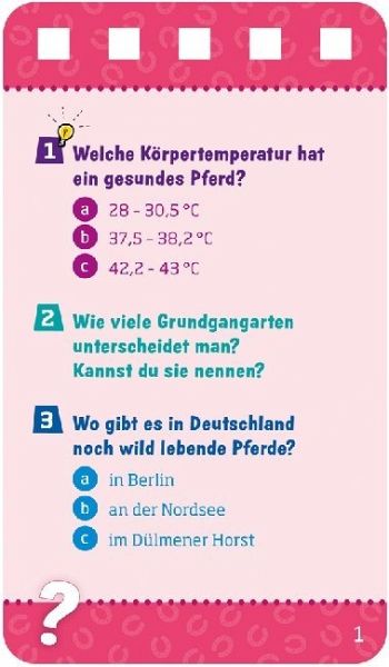Was fressen Pferde? Wozu wird ein Mistboy benötigt? Zu welchem Pferdetyp gehören Araber? Über 100 Quizfragen und -antworten bietet der Quizblock im Hosentaschenformat. Mit Spielanleitung und Punktewertung ist er einzeln oder in der Gruppe spielbar und somit die ideale Unterhaltung für unterwegs.
