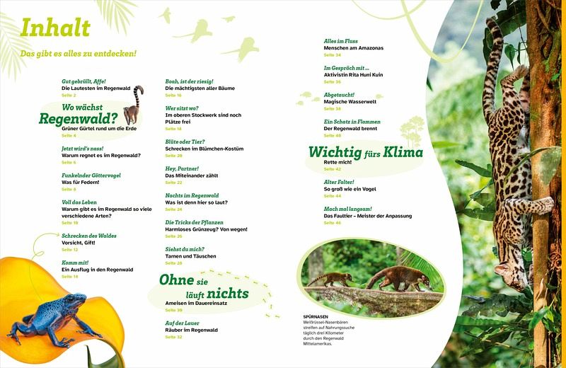 Der Regenwald gehört zu den faszinierendsten und bedrohtesten Lebensräumen der Welt. Vom Urwaldriesen bis zur winzigen Blattschneiderameise: Die Tiere und Pflanzen des Regenwaldes lassen uns staunen! Nirgendwo gibt es so viele verschiedene Arten. Um sich vor Feinden zu schützen, haben sie überraschende Strategien entwickelt. Perfekte Tarnung und wirksames Gift sind ganz vorne mit dabei, aber längst nicht alles! Regenwald gibt es in allen tropischen Regionen der Erde. Im Blickpunkt steht jedoch der Amazonas-Regenwald, in dem Faultier und Pfeilgiftfrosch, Wickelbär und Jaguar beispielhaft für die tropische Tierwelt stehen. Indigene Völker leben dort seit Jahrtausenden von den Früchten des Waldes und nutzen seine Medizin. Auch sie kommen in diesem Band zu Wort. Der Schutz des Regenwalds ist entscheidend, um den Klimawandel aufzuhalten. Gleichzeitig werden seine Auswirkungen auch dort bereits sichtbar. Das Buch gibt Anregungen dazu, was wir tun können, um die weitere Zerstörung des Regenwalds zu verhindern.