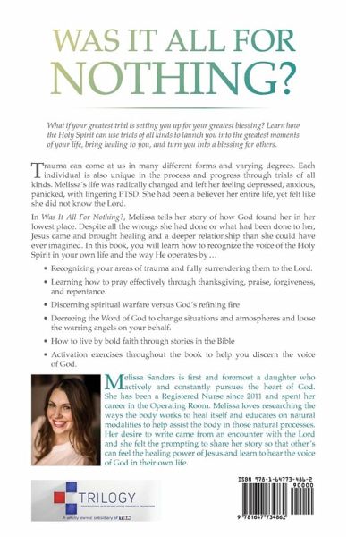 What if your greatest trial is setting you up for your greatest blessing? Learn how the Holy Spirit can use trials of all kinds to launch you into the greatest moments of your life, bring healing to you, and turn you into a blessing for others. Trauma can come at us in many different forms and varying degrees. Each individual is also unique in the process and progress through trials of all kinds. Melissa's life was radically changed and left her feeling depressed, anxious, panicked, with lingering PTSD. She had been a believer her entire life, yet felt like she did not know the Lord. In Was It All For Nothing?, Melissa tells her story of how God found her in her lowest place. Despite all the wrongs she had done or what had been done to her, Jesus came and brought healing and a deeper relationship than she could have ever imagined. In this book, you will learn how to recognize the voice of the Holy Spirit in your own life and the way He operates by ... * Recognizing your areas of trauma and fully surrendering them to the Lord. * Learning how to pray effectively through thanksgiving, praise, forgiveness, and repentance. * Discerning spiritual warfare versus God's refining fire * Decreeing the Word of God to change situations and atmospheres and loose the warring angels on your behalf. * How to live by bold faith through stories in the Bible * Activation exercises throughout the book to help you discern the voice of God.