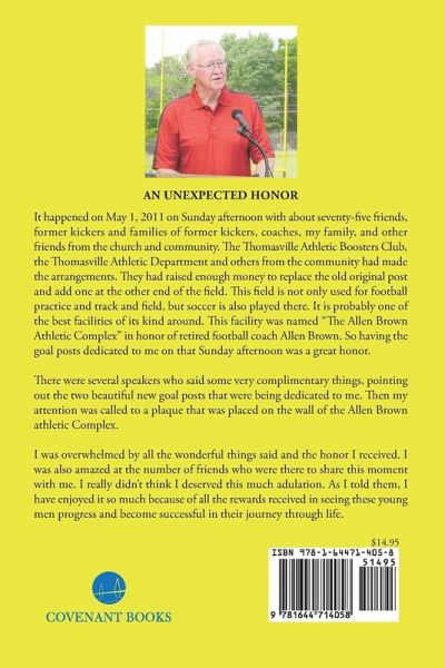 An Unexpected Honor It happened on May 1, 2011 on Sunday afternoon with about seventy-five friends, former kickers and families of former kickers, coaches, my family, and other friends from the church and community. The Thomasville Athletic Boosters Club, the Thomasville Athletic Department and others from the community had made the arrangements. They had raised enough money to replace the old original post and add one at the other end of the field. This field is not only used for football practice and track and field, but soccer is also played there. It is probably one of the best facilities of its kind around. This facility was named "The Allen Brown Athletic Complex" in honor of retired football coach Allen Brown. So having the goal posts dedicated to me on that Sunday afternoon was a great honor. There were several speakers who said some very complimentary things, pointing out the two beautiful new goal posts that were being dedicated to me. Then my attention was called to a plaque that was placed on the wall of the Allen Brown athletic Complex. I was overwhelmed by all the wonderful things said and the honor I received. I was also amazed at the number of friends who were there to share this moment with me. I really didn’t think I deserved this much adulation. As I told them, I have enjoyed it so much because of all the rewards received in seeing these young men progress and become successful in their journey through life.